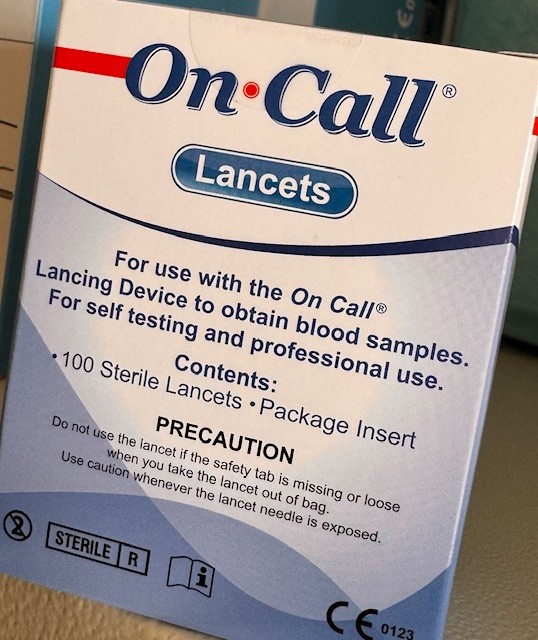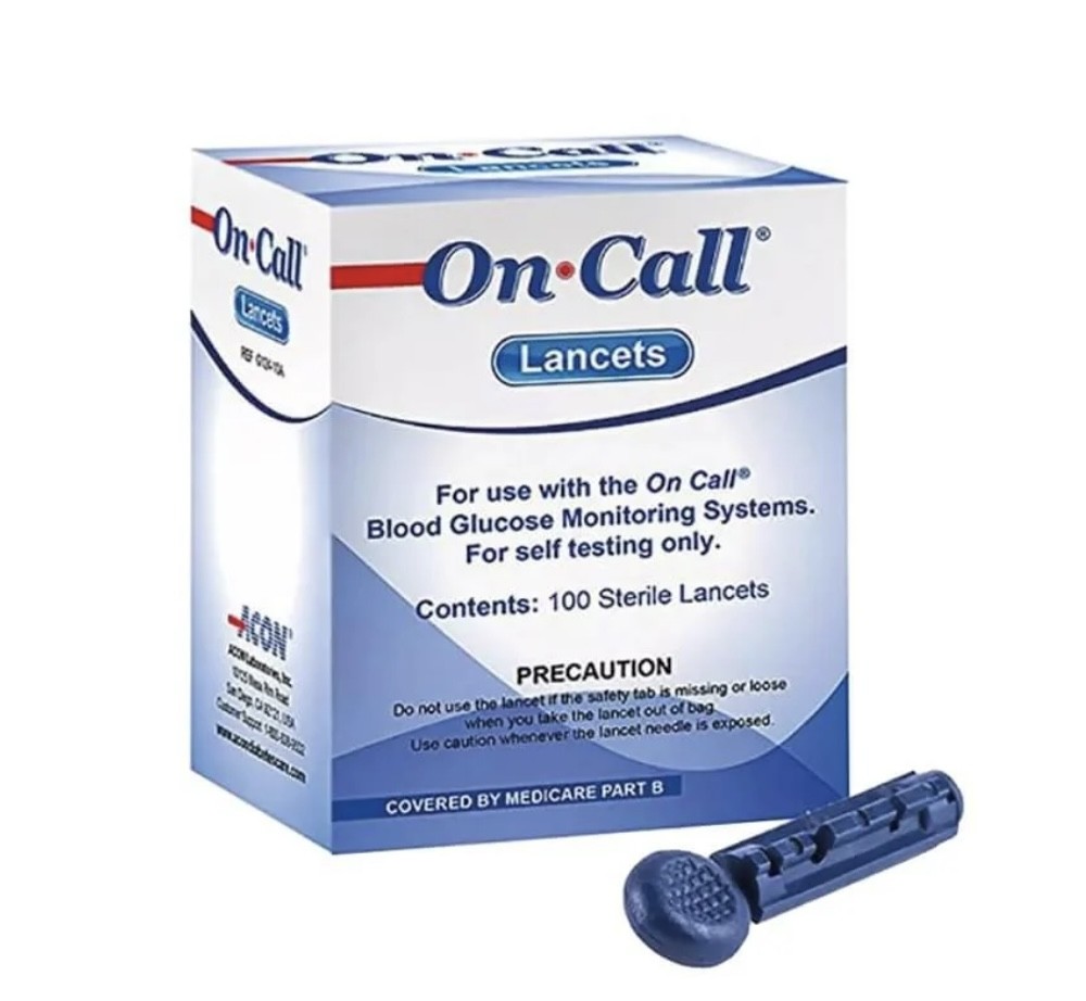 OnCall Sure Lancets 30 G Box of 100 lancets , designed to minimize pain , thin , sterile needles , compatible with most lancing devices and featuring finer needles (30G). These single use lancets are gamma-radiation sterilized and should not be reused.